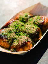 ふっくら、とろっと焼き上げ、その中にタコがごろり!野菜と果物をたっぷり使ったソースで召し上がれっ♪